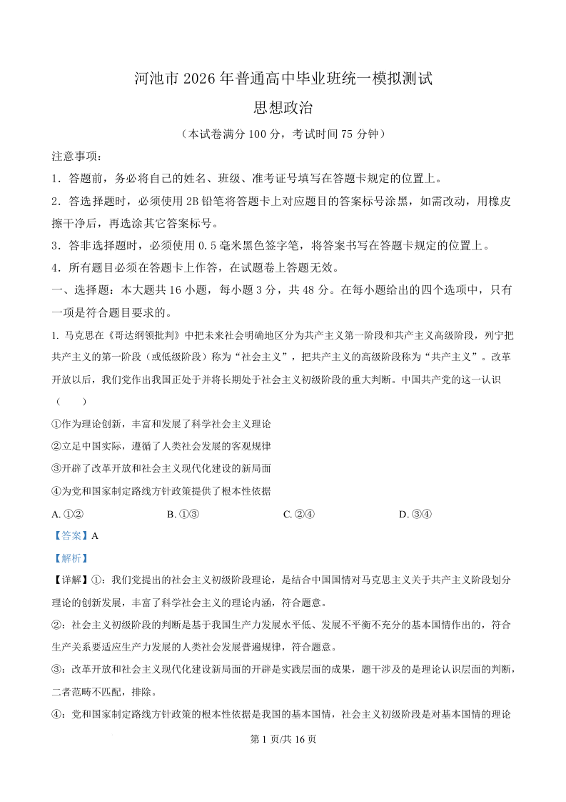 河池市2026年普通高中毕业班统一模拟测试 政治答案.docx