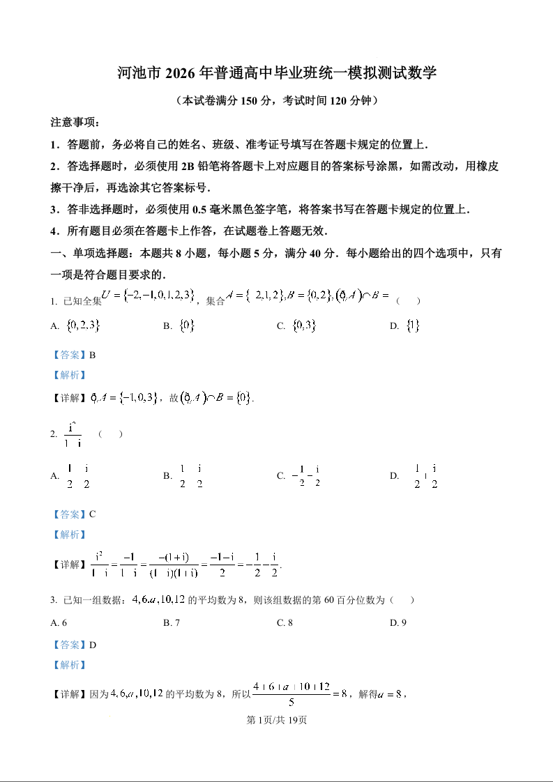 河池市2026年普通高中毕业班统一模拟测试 数学答案.docx