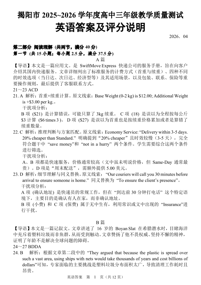 揭阳市2025-2026学年度高三年级教学质量测试 英语答案.pdf
