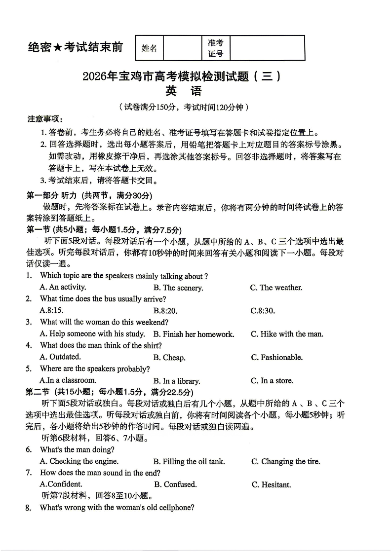 陕西省宝鸡市2026届高三下学期模拟检测(三)英语.pdf