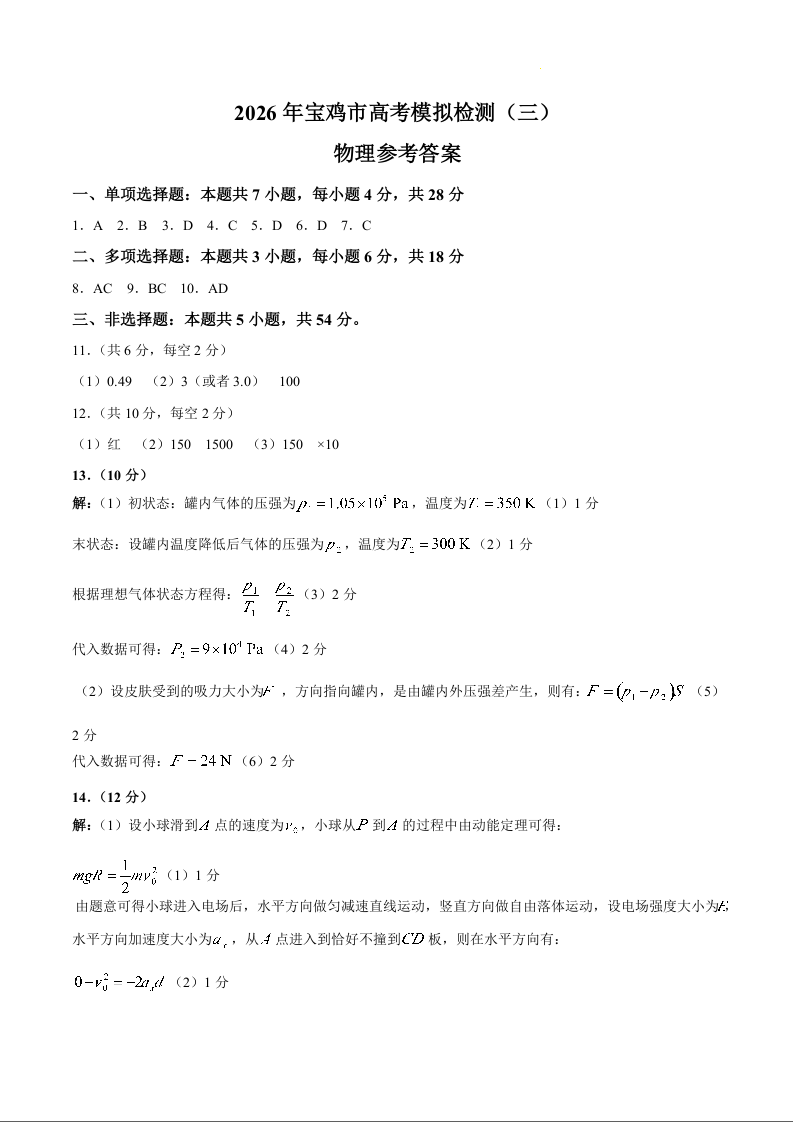 陕西省宝鸡市2026届高三下学期模拟检测(三)物理答案.docx