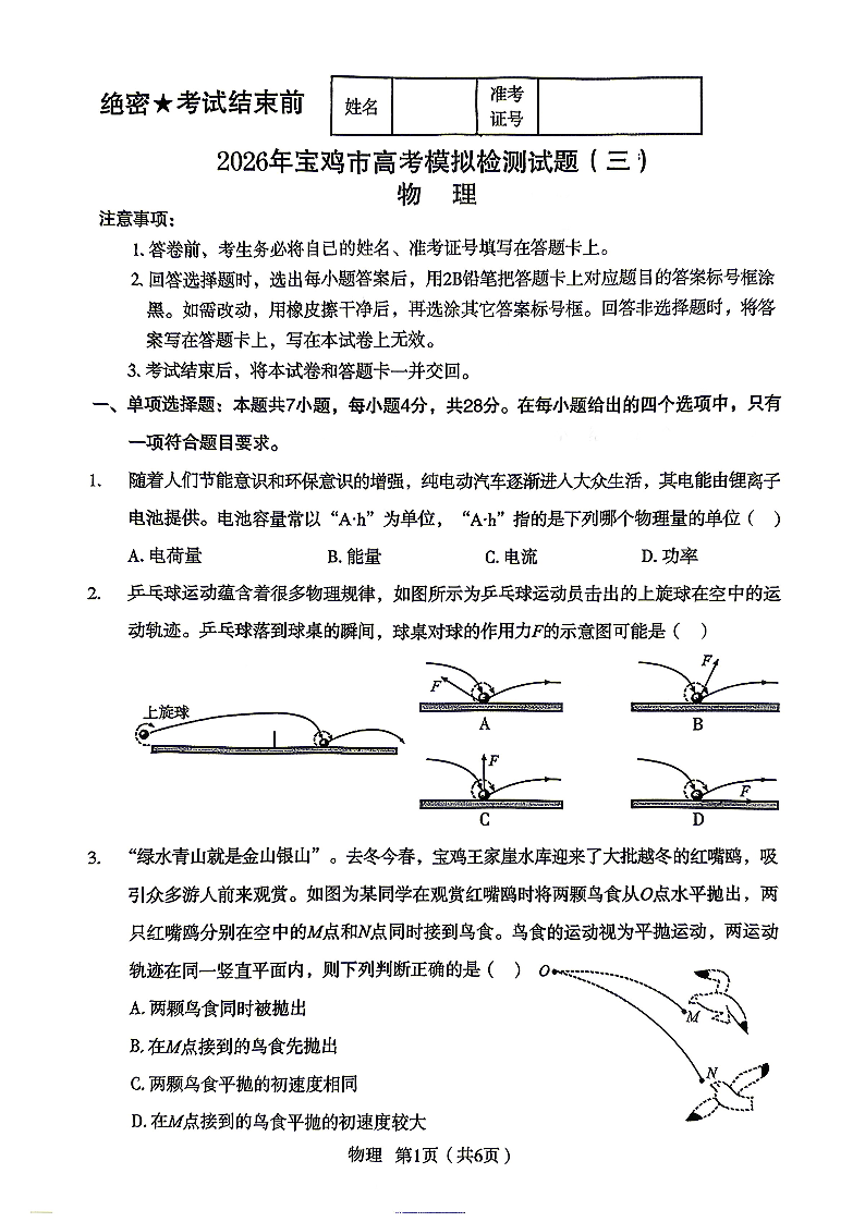陕西省宝鸡市2026届高三下学期模拟检测(三)物理.pdf