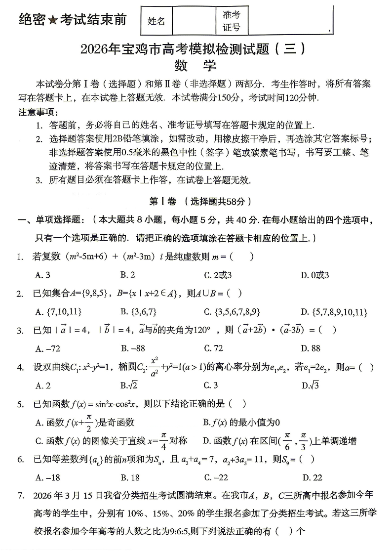 陕西省宝鸡市2026届高三下学期模拟检测(三)数学.pdf