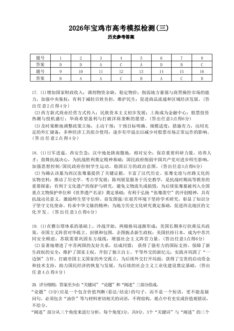陕西省宝鸡市2026届高三下学期模拟检测(三)历史答案.pdf