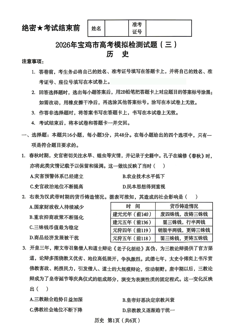 陕西省宝鸡市2026届高三下学期模拟检测(三)历史.pdf