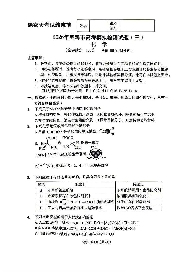 陕西省宝鸡市2026届高三下学期模拟检测(三)化学.pdf