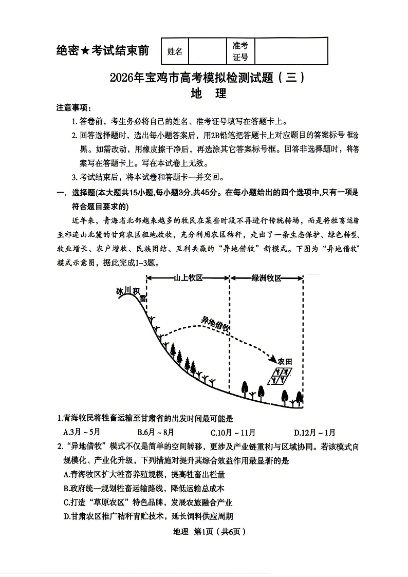 陕西省宝鸡市2026届高三下学期模拟检测(三)地理.pdf