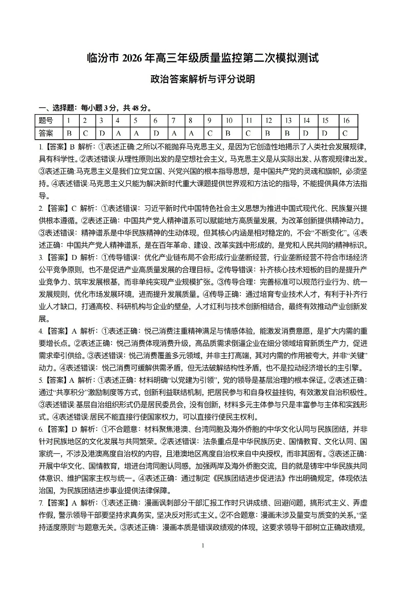 山西省临汾市2026年高三年级质量监控第二次模拟考试 政治答案.pdf