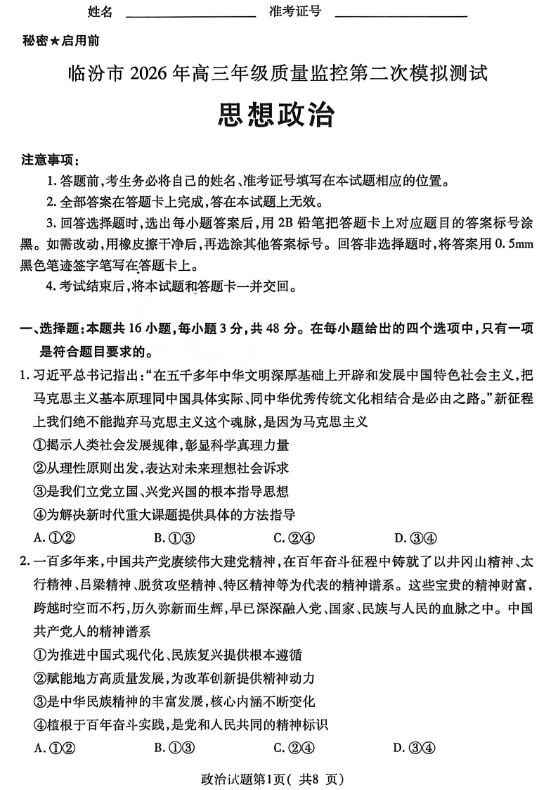 山西省临汾市2026年高三年级质量监控第二次模拟考试 政治.pdf