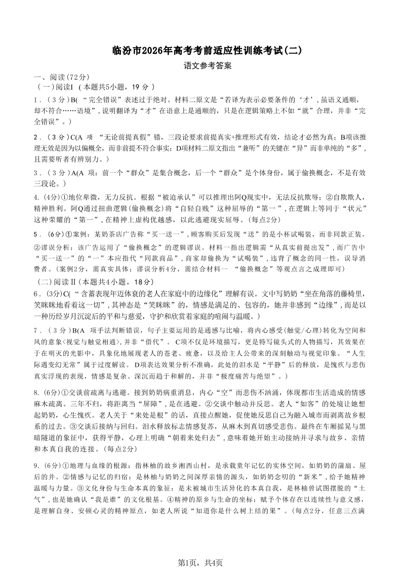 山西省临汾市2026年高三年级质量监控第二次模拟考试 语文答案.pdf