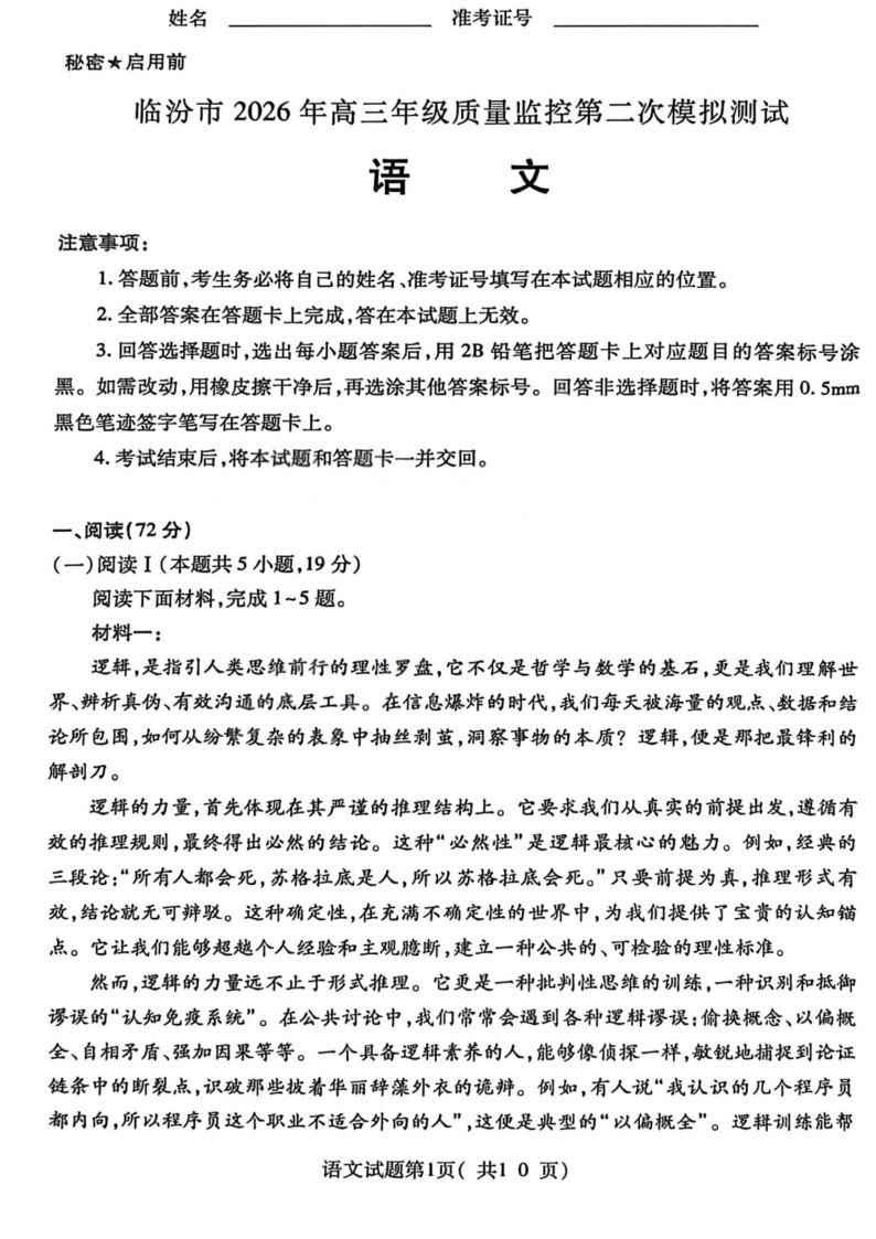 山西省临汾市2026年高三年级质量监控第二次模拟考试 语文.pdf