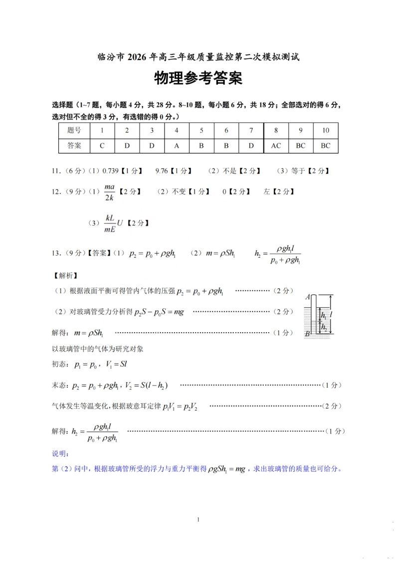 山西省临汾市2026年高三年级质量监控第二次模拟考试 物理答案.pdf