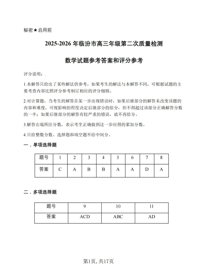 山西省临汾市2026年高三年级质量监控第二次模拟考试 数学答案.pdf