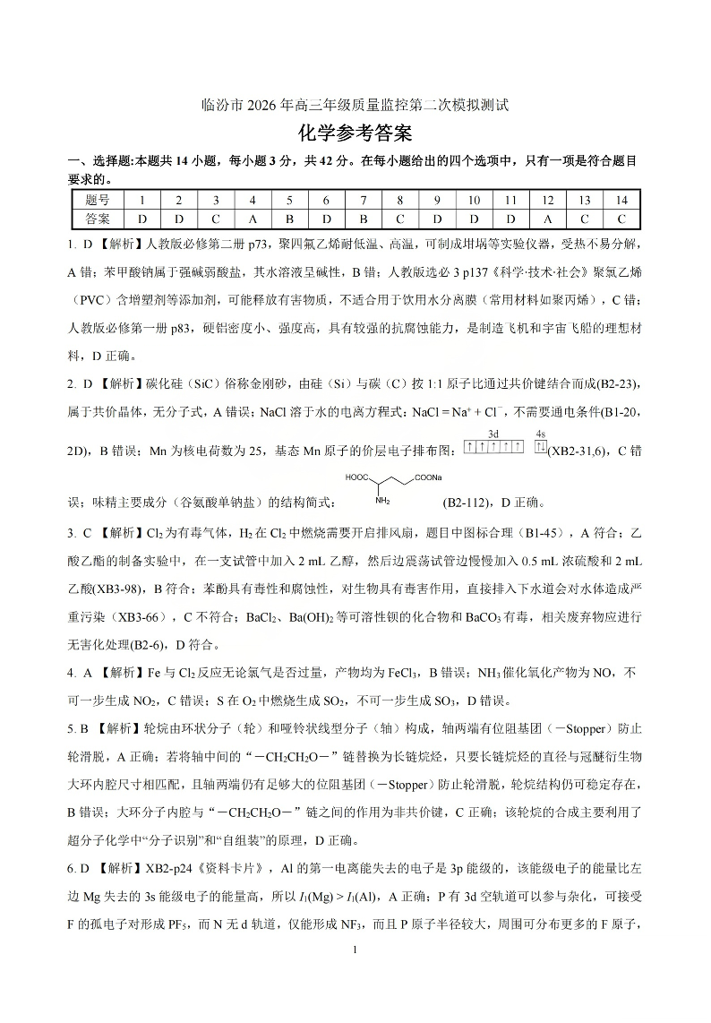 山西省临汾市2026年高三年级质量监控第二次模拟考试 化学答案.pdf