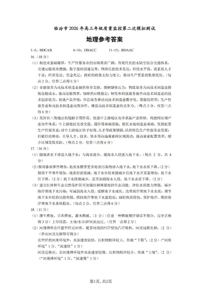 山西省临汾市2026年高三年级质量监控第二次模拟考试 地理答案.pdf