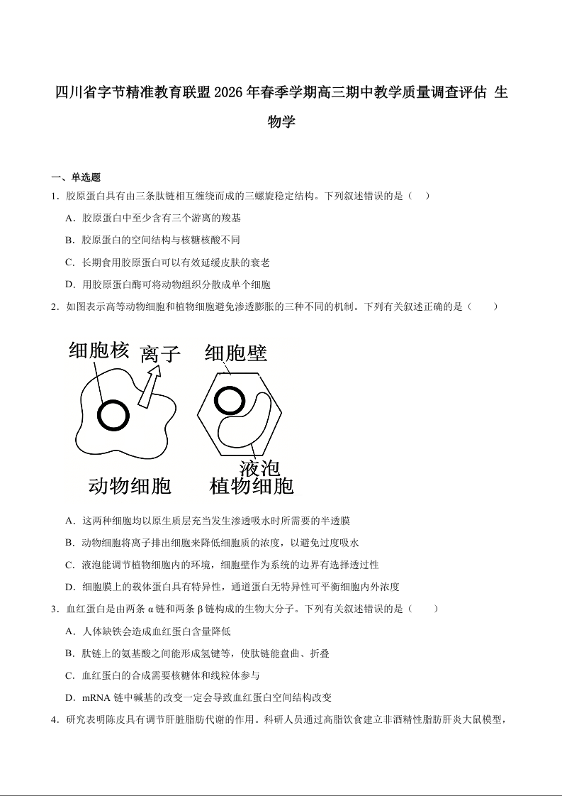 字节精准教育联盟2026届高三下学期4月期中考试 生物试题(含答案).docx