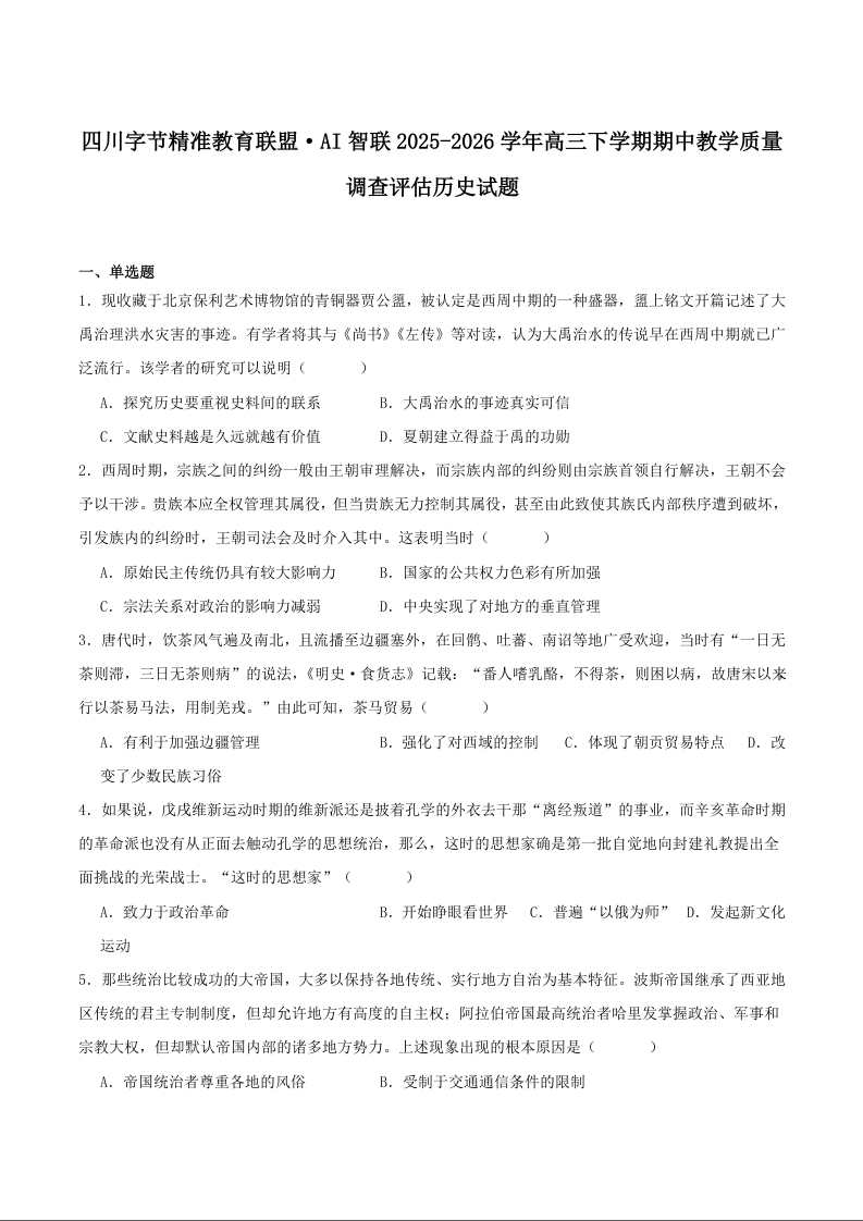 字节精准教育联盟2026届高三下学期4月期中考试 历史试题(含答案).docx