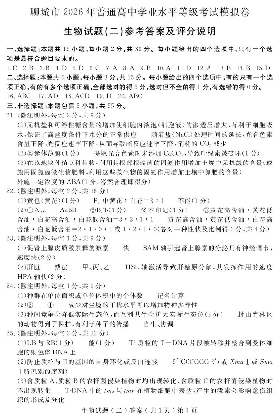 聊城市2026年普通高中学业水平等级考试模拟卷 生物答案.pdf