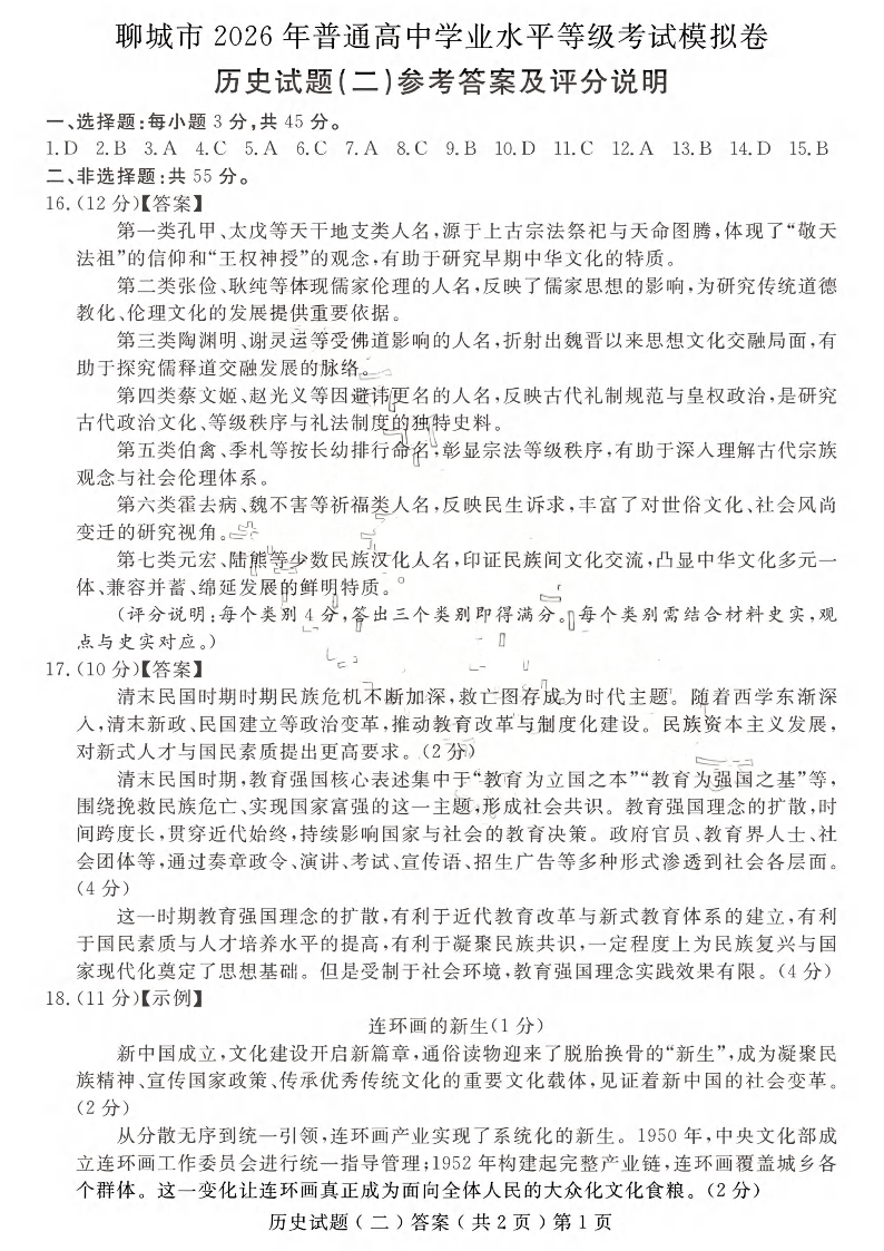 聊城市2026年普通高中学业水平等级考试模拟卷 历史答案.pdf