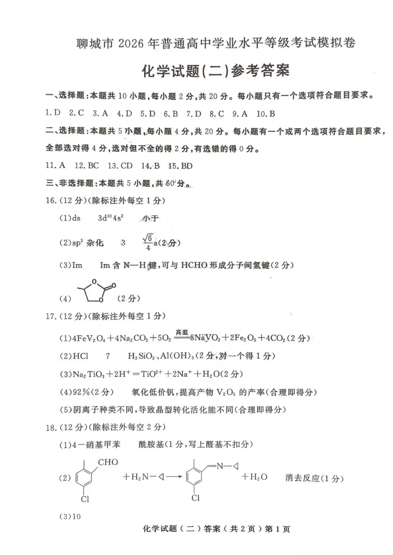 聊城市2026年普通高中学业水平等级考试模拟卷 化学答案.pdf