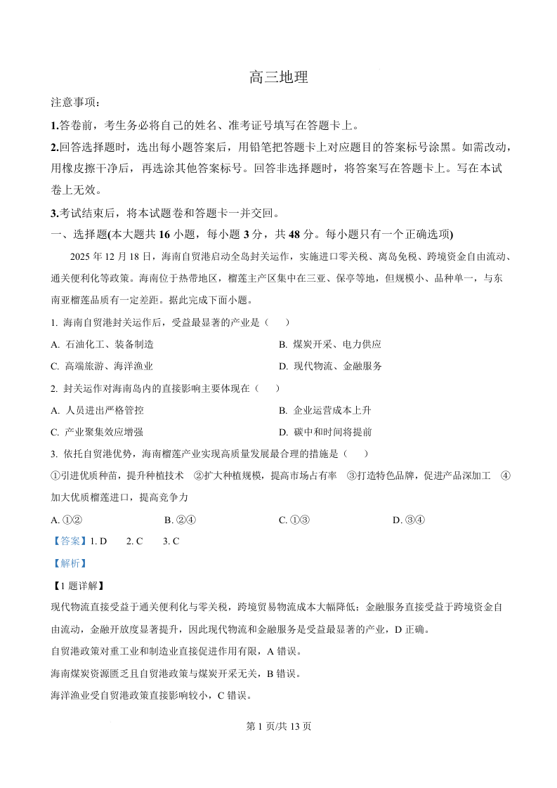 湖南省长沙市第一中学2026届高三下学期第九次月考 地理答案.docx