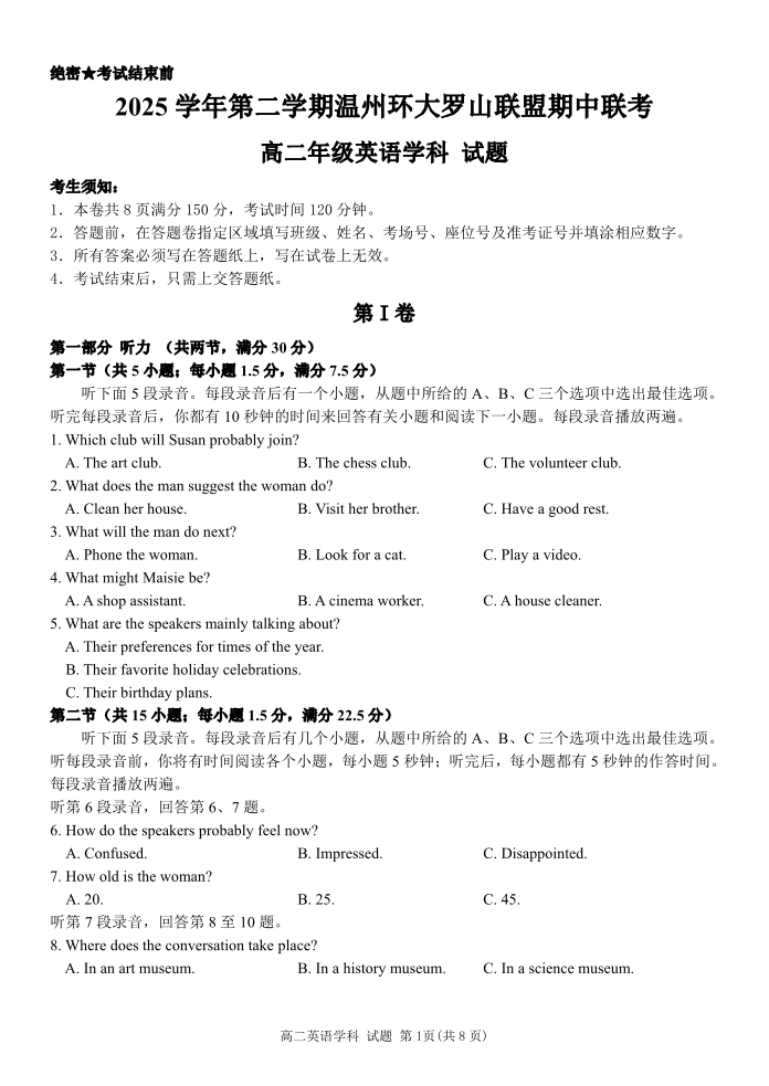 浙江省温州市环大罗山联盟2025学年第二学期高二年级期中联考 英语.pdf