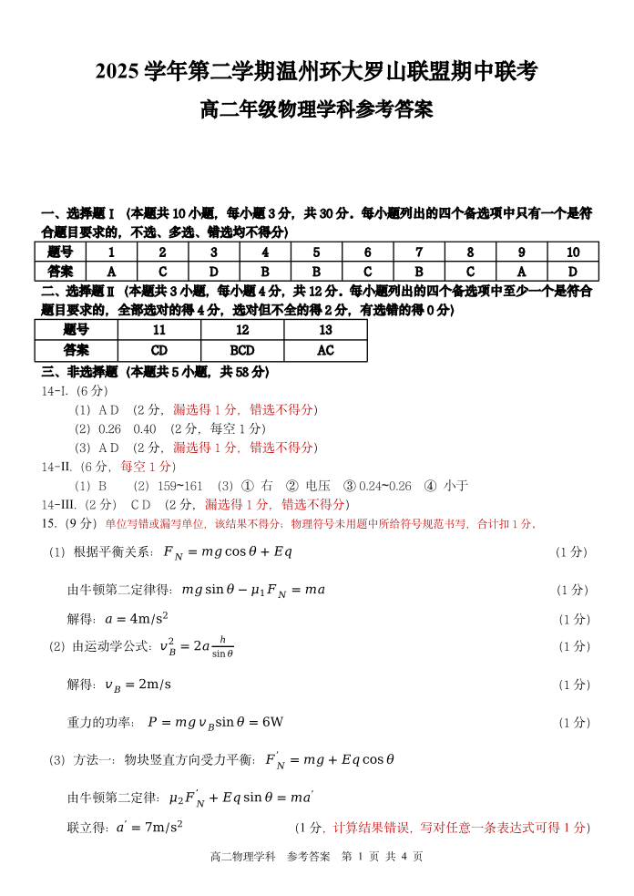 浙江省温州市环大罗山联盟2025学年第二学期高二年级期中联考 物理答案.pdf