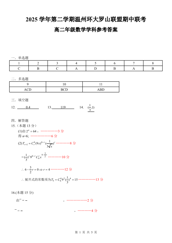 浙江省温州市环大罗山联盟2025学年第二学期高二年级期中联考 数学答案.pdf