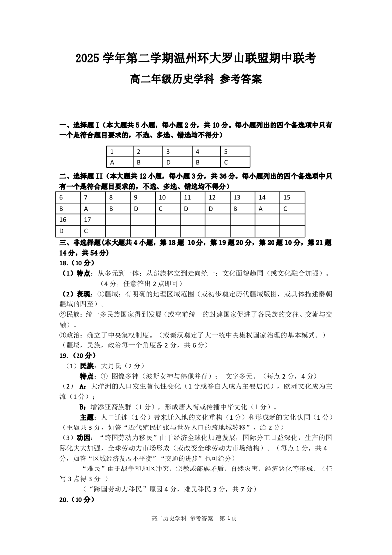 浙江省温州市环大罗山联盟2025学年第二学期高二年级期中联考 历史答案.pdf