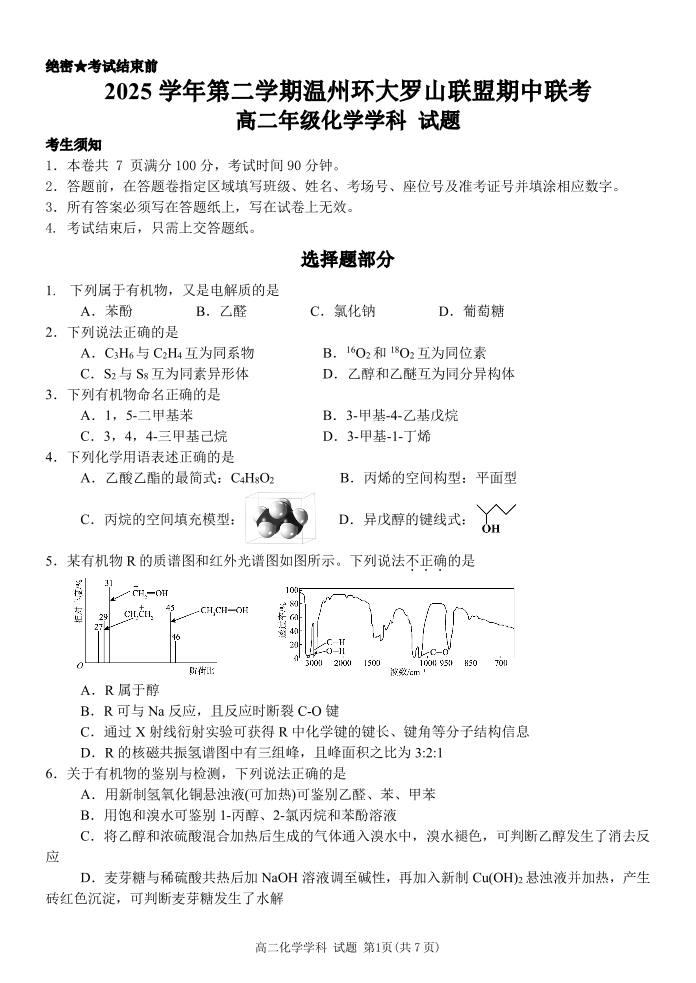 浙江省温州市环大罗山联盟2025学年第二学期高二年级期中联考 化学.pdf
