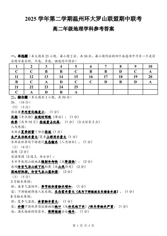 浙江省温州市环大罗山联盟2025学年第二学期高二年级期中联考 地理答案.pdf