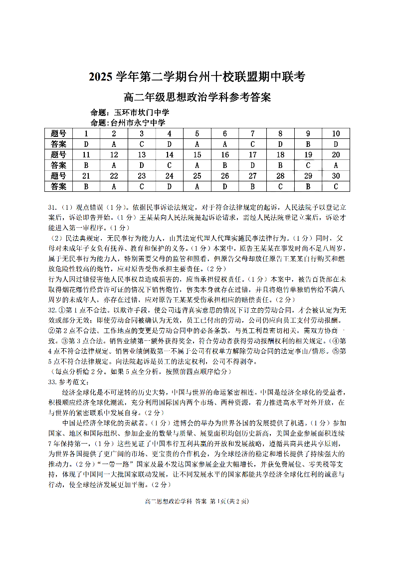 台州十校联盟2025学年高二第二学期期中联考 政治答案.pdf