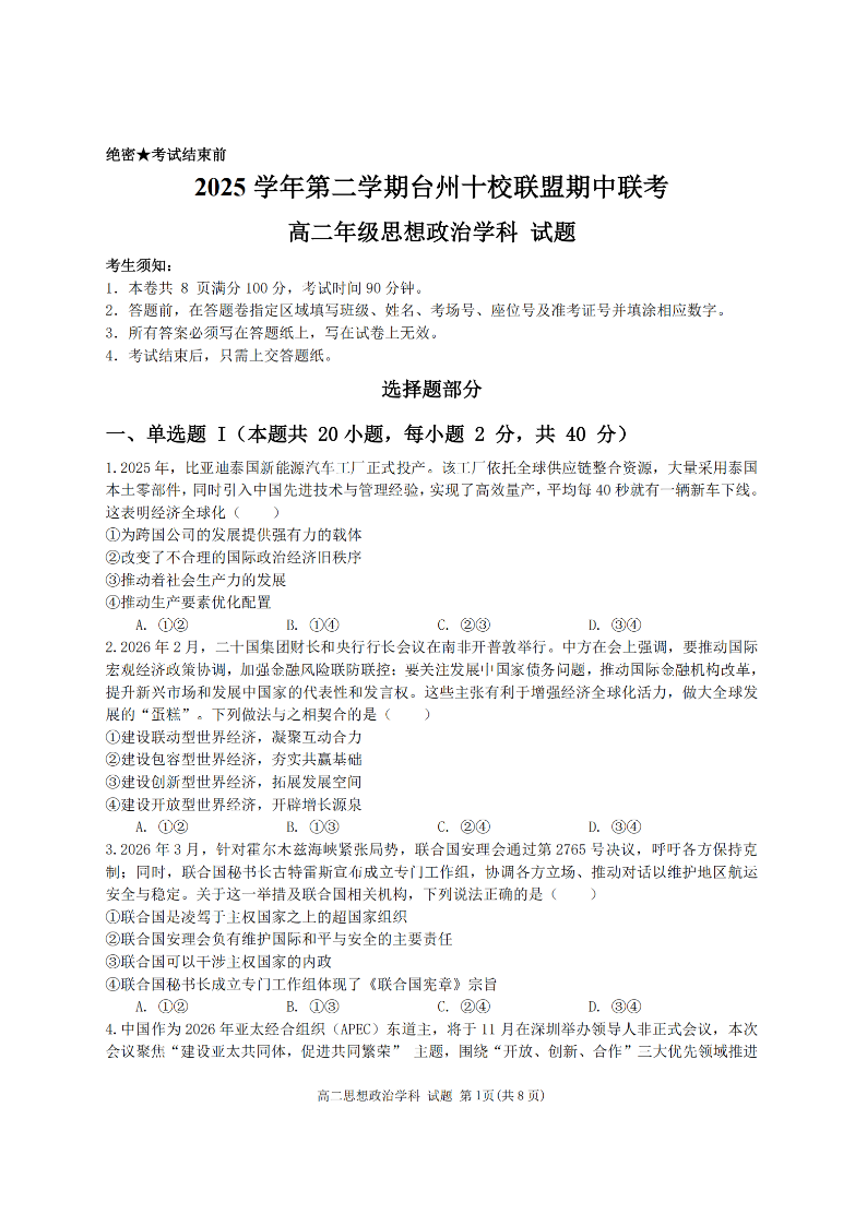 台州十校联盟2025学年高二第二学期期中联考 政治.pdf