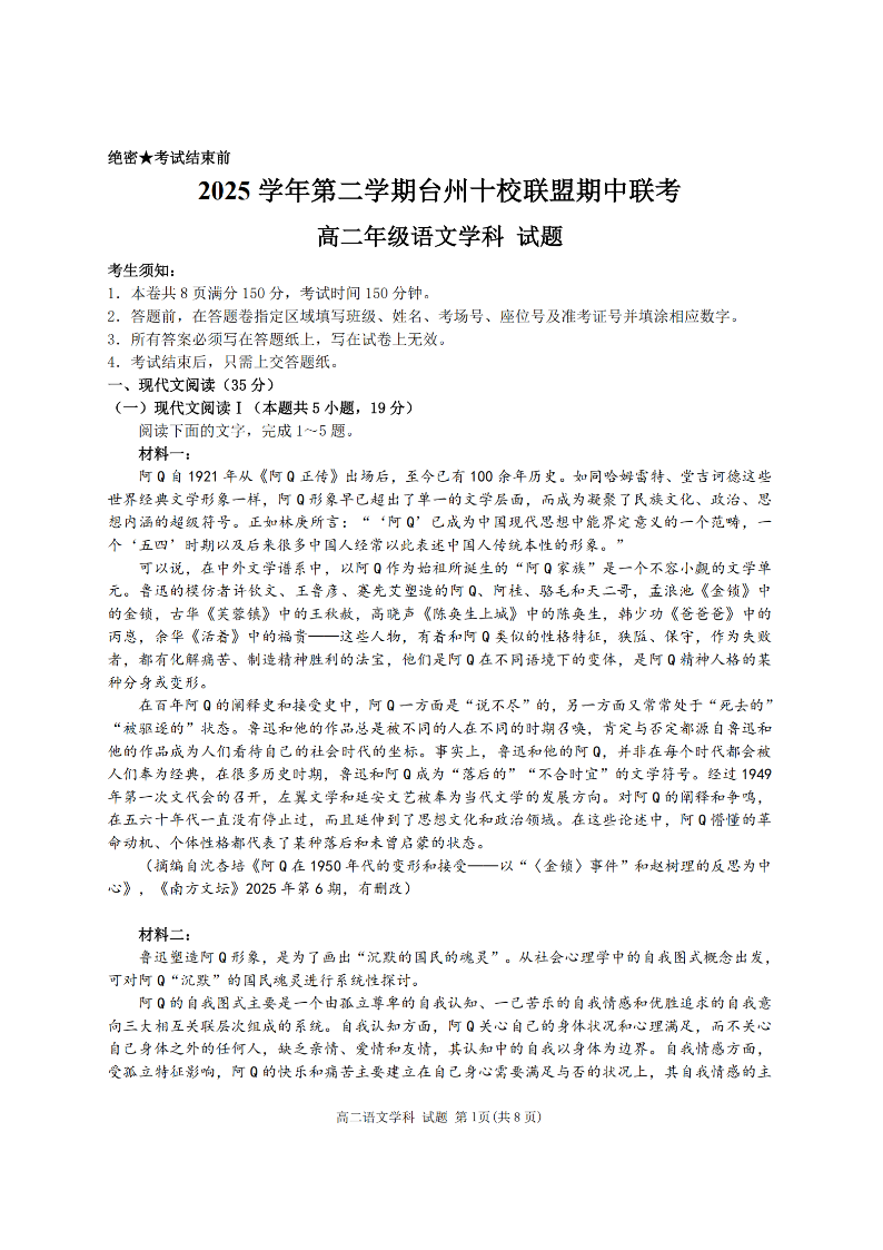 台州十校联盟2025学年高二第二学期期中联考 语文.pdf