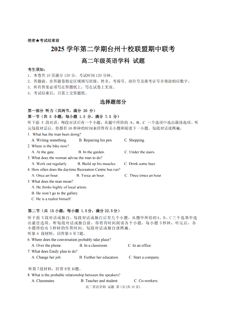 台州十校联盟2025学年高二第二学期期中联考 英语.pdf