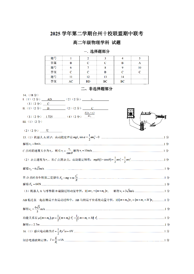 台州十校联盟2025学年高二第二学期期中联考 物理答案.pdf