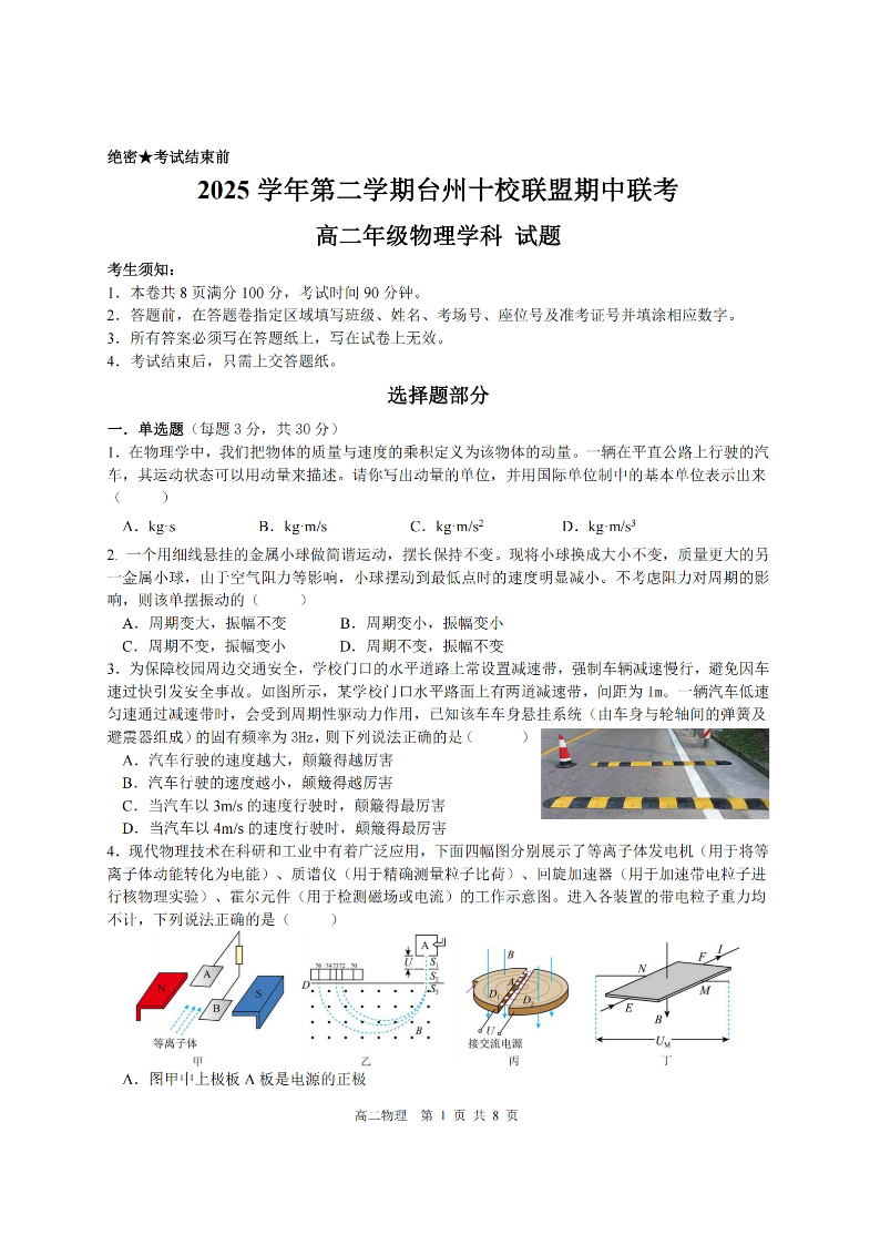 台州十校联盟2025学年高二第二学期期中联考 物理.pdf