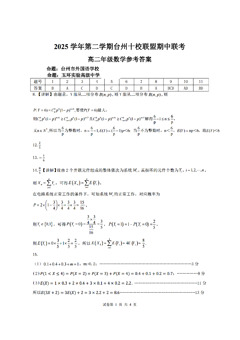 台州十校联盟2025学年高二第二学期期中联考 数学答案.pdf