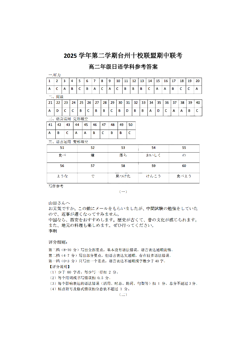 台州十校联盟2025学年高二第二学期期中联考 日语答案.pdf