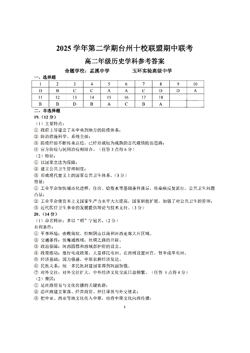 台州十校联盟2025学年高二第二学期期中联考 历史答案.pdf