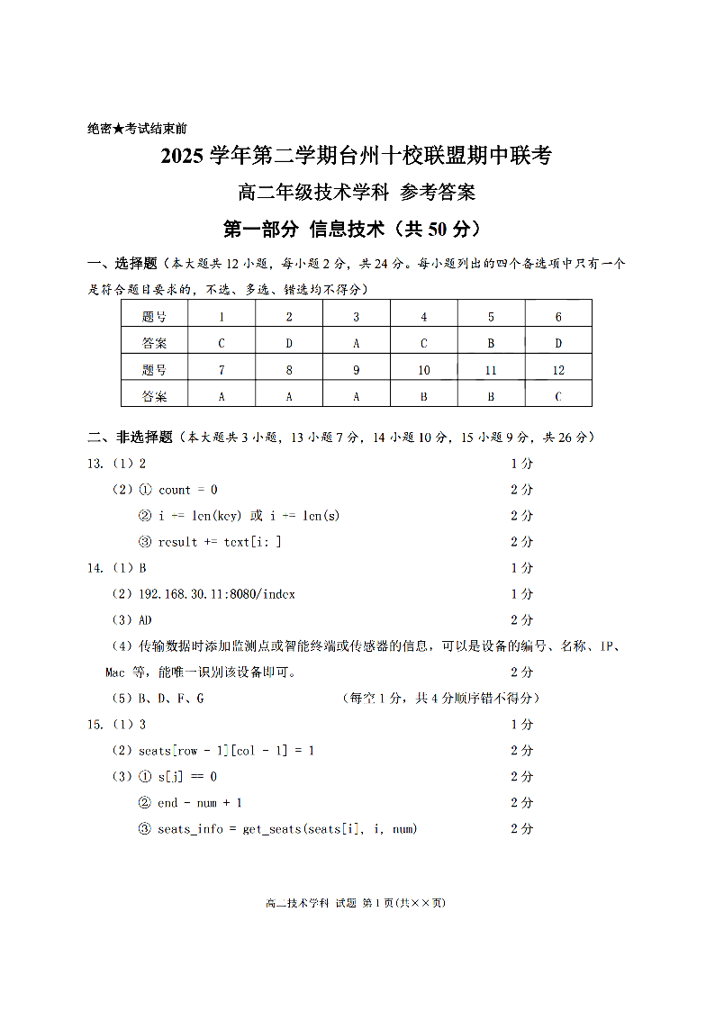 台州十校联盟2025学年高二第二学期期中联考 技术答案.pdf