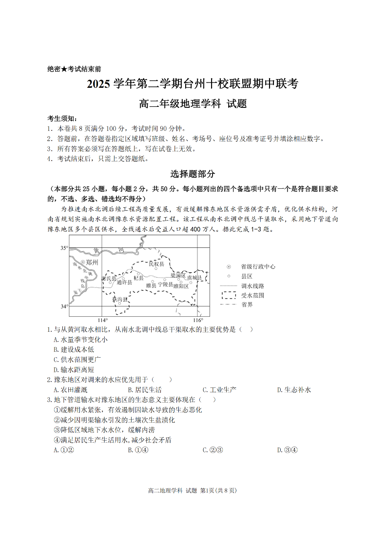 台州十校联盟2025学年高二第二学期期中联考 地理.pdf