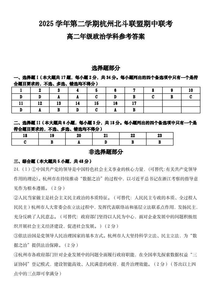 浙江省杭州市北斗联盟2025学年第二学期高二年级期中联考 政治答案.pdf