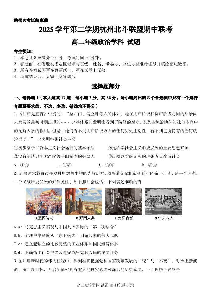 浙江省杭州市北斗联盟2025学年第二学期高二年级期中联考 政治.pdf