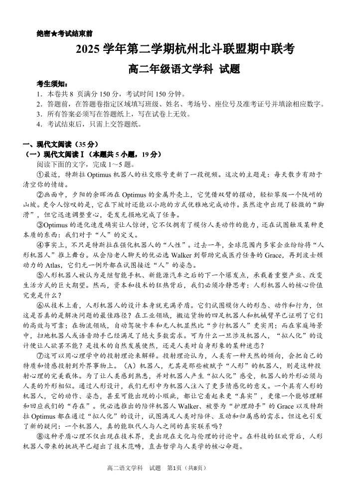 浙江省杭州市北斗联盟2025学年第二学期高二年级期中联考 语文.pdf