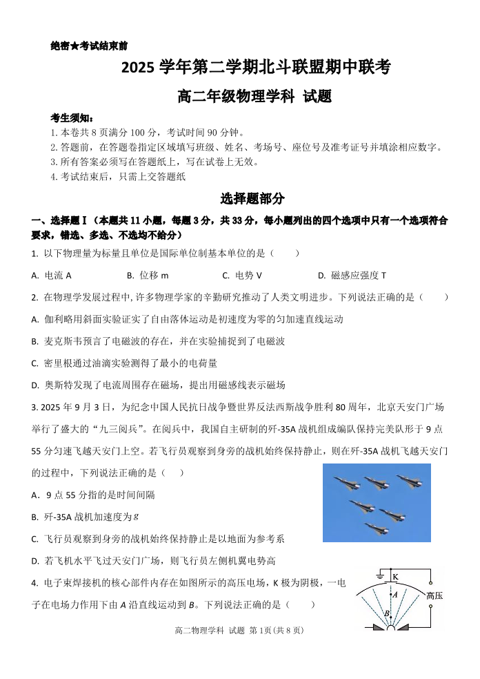 浙江省杭州市北斗联盟2025学年第二学期高二年级期中联考 物理.pdf