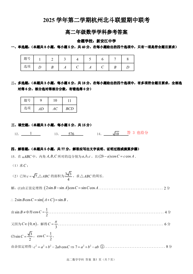 浙江省杭州市北斗联盟2025学年第二学期高二年级期中联考 数学答案.pdf