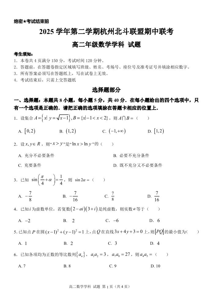 浙江省杭州市北斗联盟2025学年第二学期高二年级期中联考 数学.pdf
