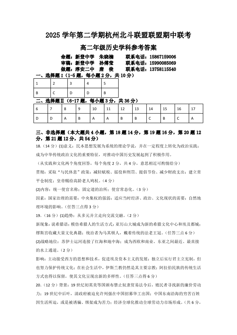 浙江省杭州市北斗联盟2025学年第二学期高二年级期中联考 历史答案.pdf