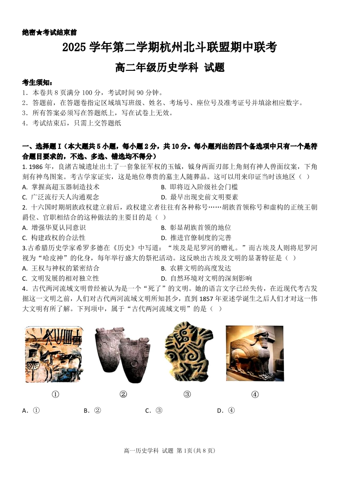 浙江省杭州市北斗联盟2025学年第二学期高二年级期中联考 历史.pdf
